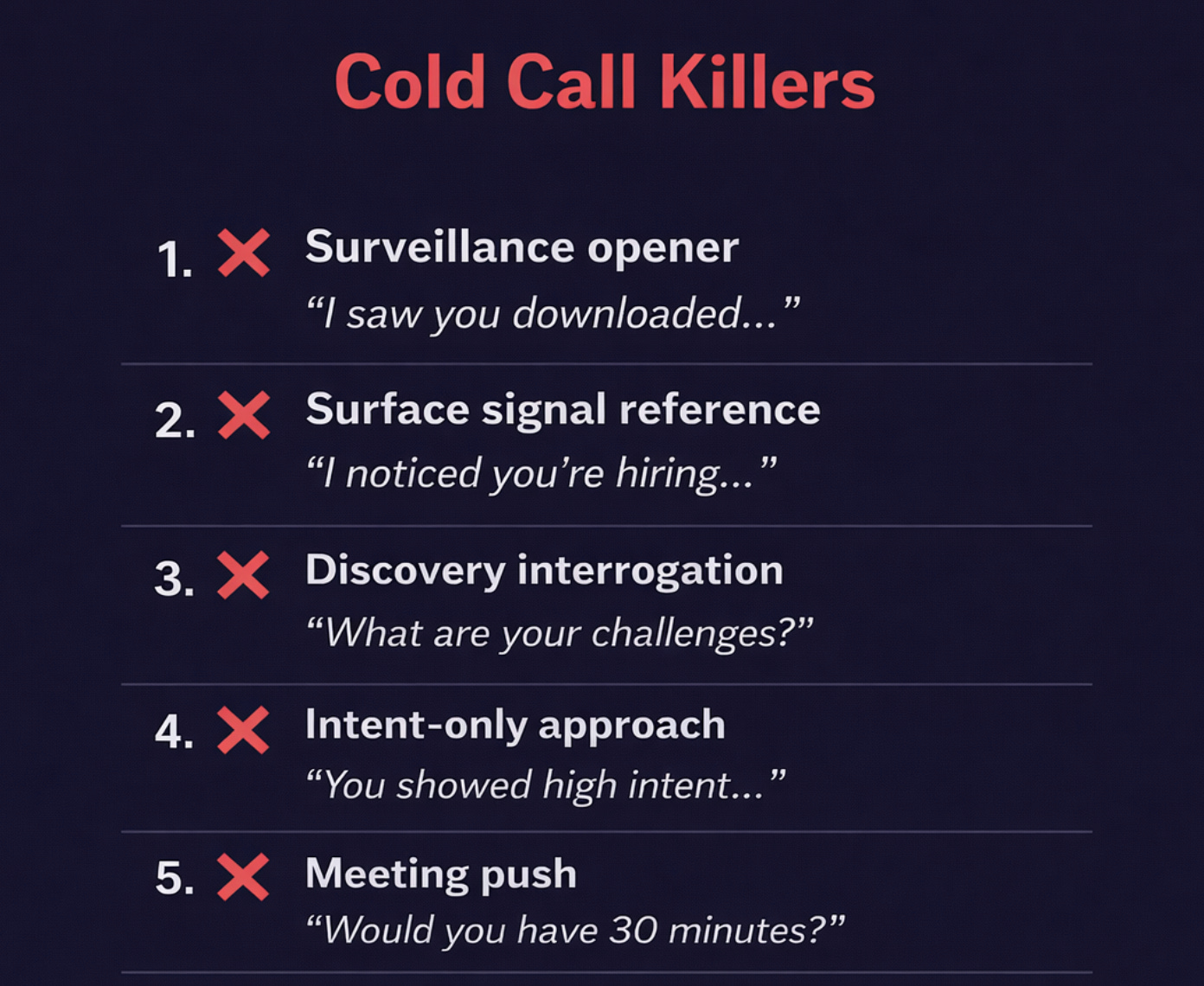 Opening with discovery burns trust. You should already know their likely pain based on strategic signals.