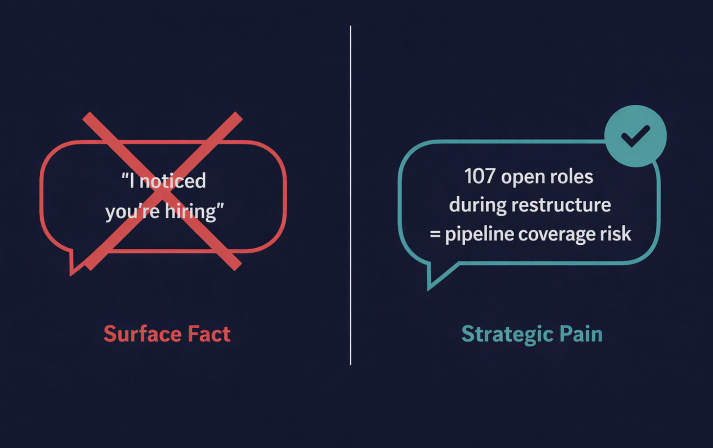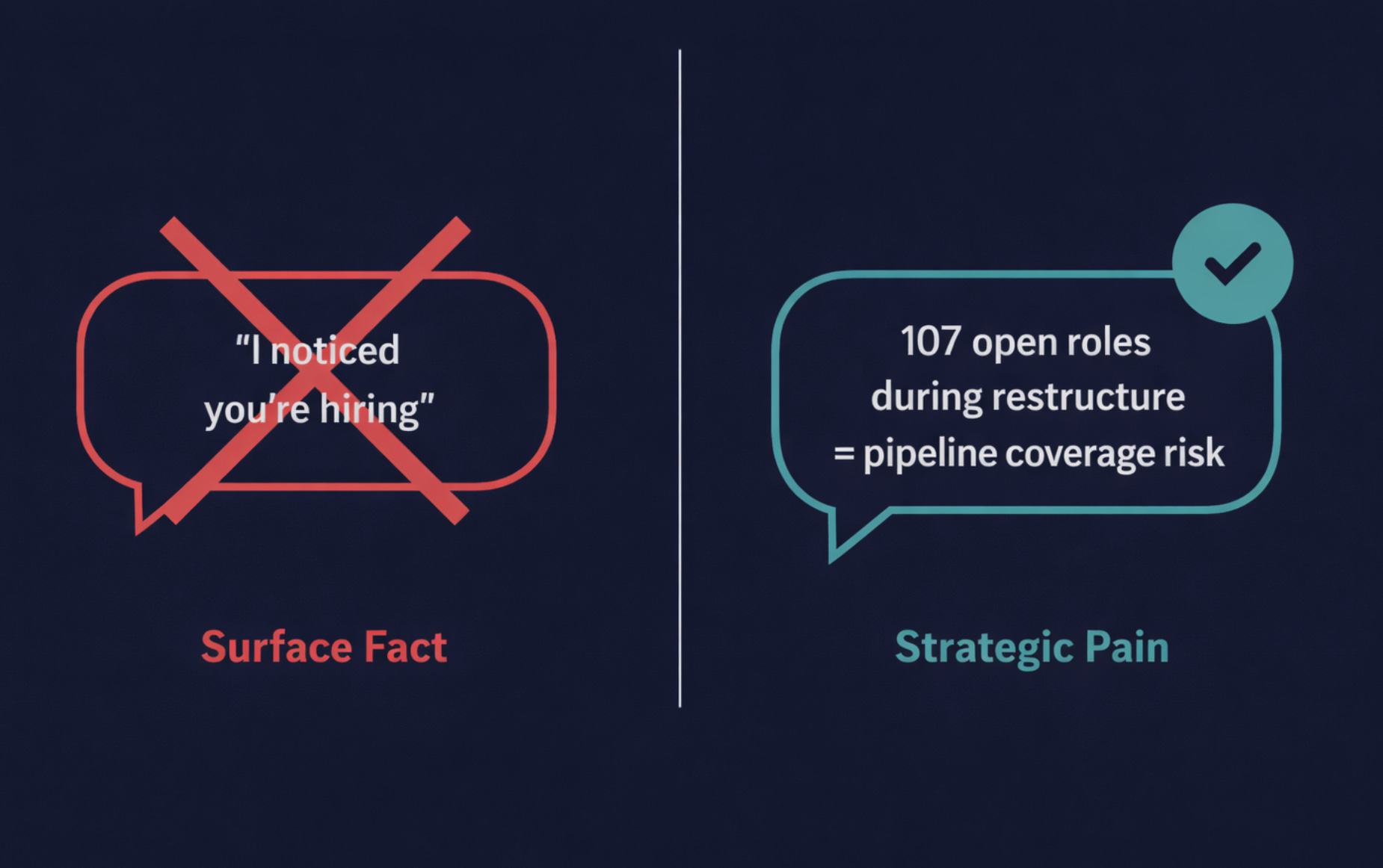 Hiring is a fact. “107 open roles during restructure means pipeline coverage risk” is strategic pain. One opens conversations. One gets ignored.