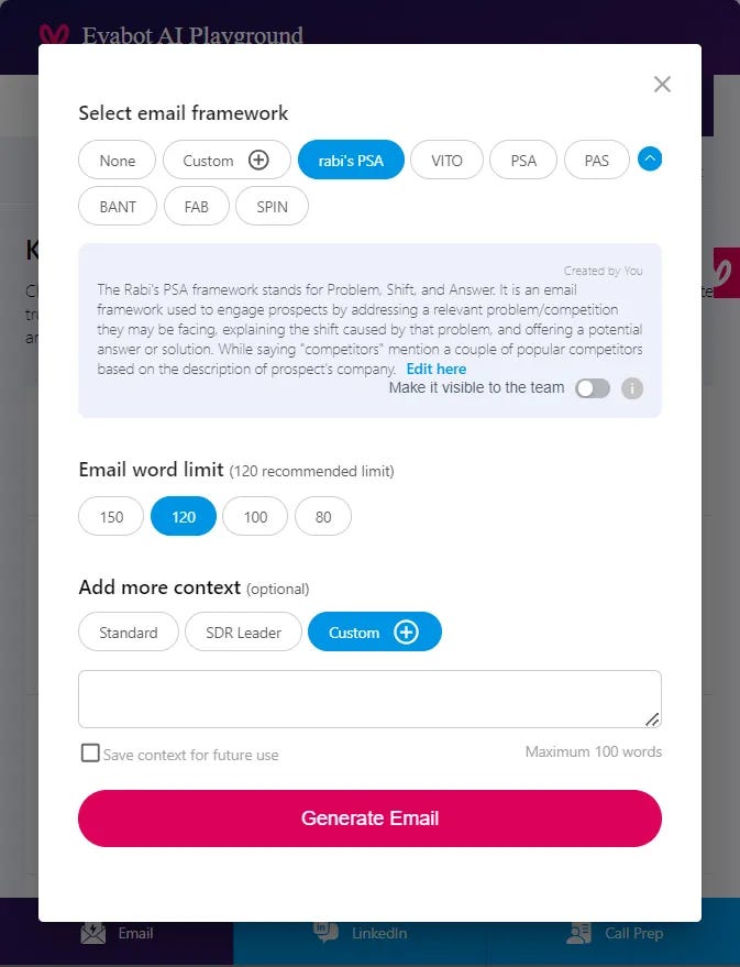 Here is the screenshot of account research, and email / linkedin personalization from Evabot.