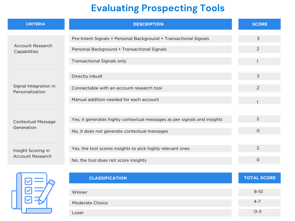For evaluating any prospecting tool / combo that can help you with both account research and personalization, answer the following questions: