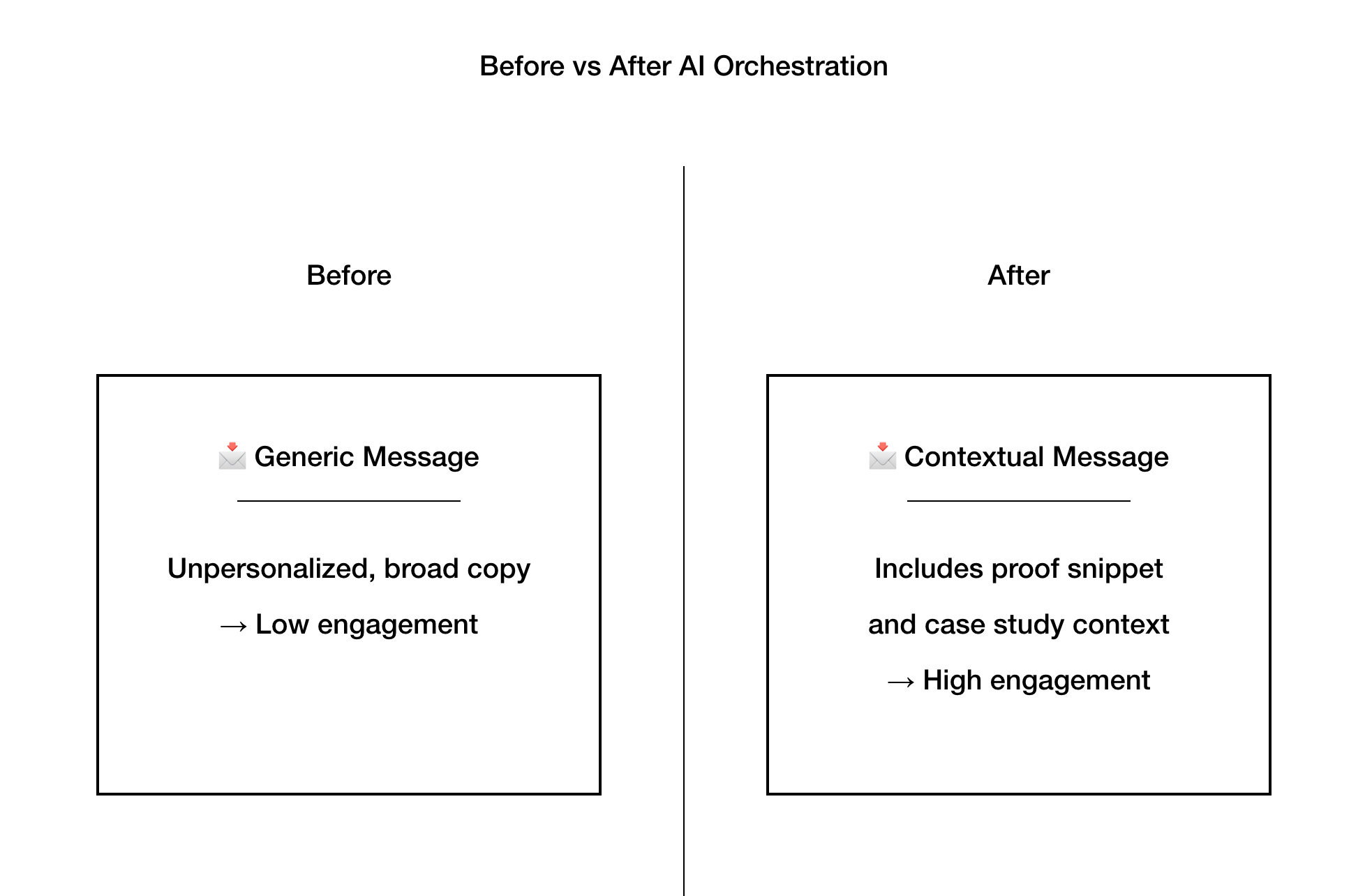 “Hi [Name], noticed you’re hiring. We help companies scale their sales teams more effectively.”After AI orchestration: